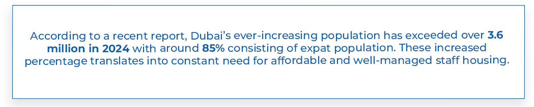 - Compliance Benefits: Purposefully-designed staff housing facilities comply with Dubai Municipality and Civil Defense regulations that make them an attractive investment that prioritize to comply legal standards for workers’ safety.